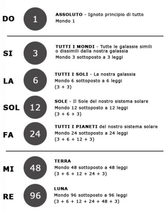 L’Assoluto è il do di questa ottava. I mondi che l’Assoluto crea in se stesso sono si. L’intervallo tra do e si è riempito in questo caso dalla volontà dell’Assoluto. II processo di creazione si sviluppa ulteriormente con la forza dell’impulso iniziale, più uno shock addizionale. Si passa al la che è per noi il mondo degli astri, la Via Lattea. La passa al sol, il nostro Sole, il sistema solare. Sol passa al fa, il mondo planetario. E qui, tra il mondo planetario, preso come un tutto, e la nostra Terra, si presenta un intervallo. Questo significa che le radiazioni planetarie, che portano diverse influenze alla Terra, non possono raggiungerla o, più esattamente, non sono ricevute: la Terra le riflette.