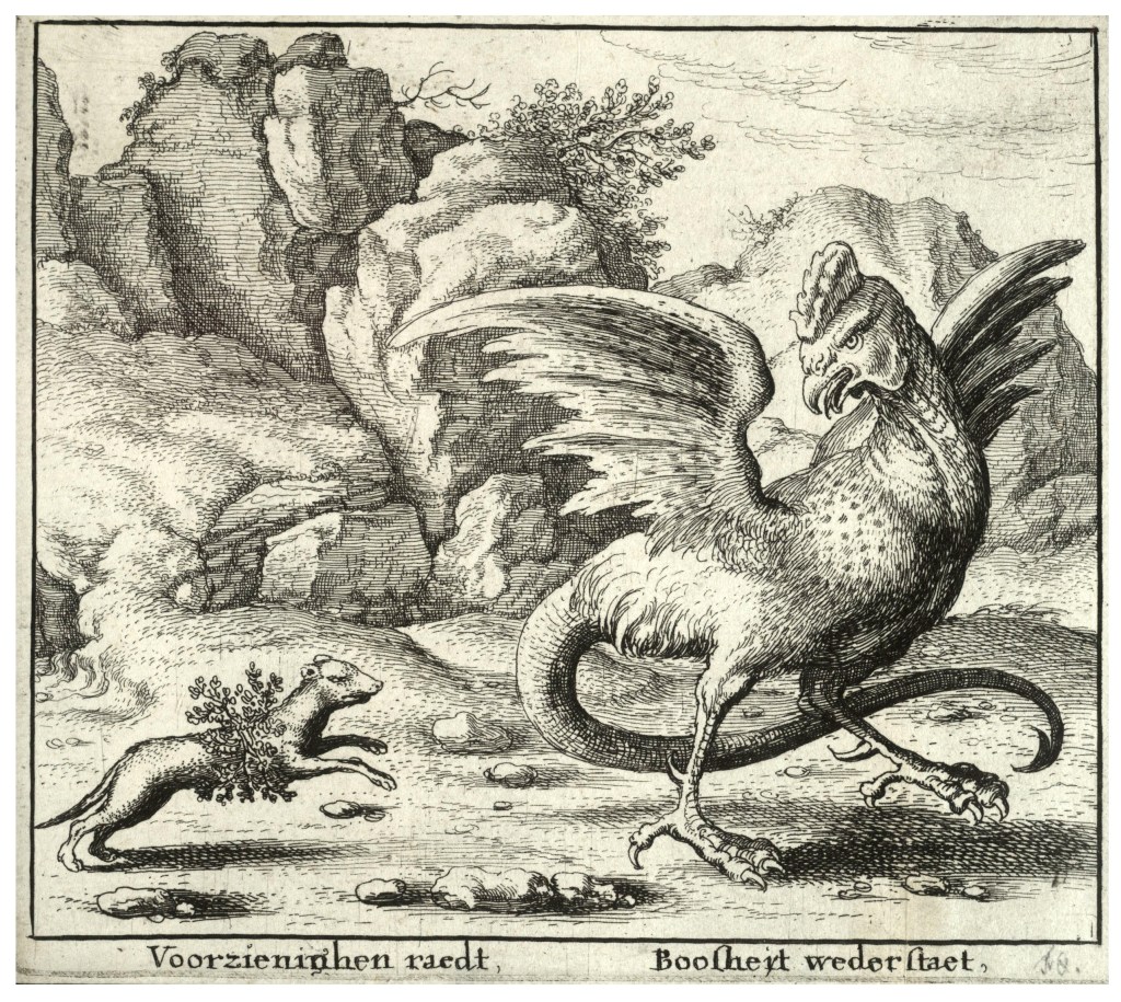 Nei Bestiari e nelle leggende greche ed europee, il Basilisco (dal greco βασιλίσκος , basilískos, “piccolo re” da βασιλεύς, basiléus, “re”; in latino rēx, regis) è una creatura mitologica citata anche come “re dei serpenti” (epiteto che gli deriva da una macchia bianca che ha in testa come fosse un diadema). Viene dipinto con l’aspetto di un rettile con la testa di gallo.
