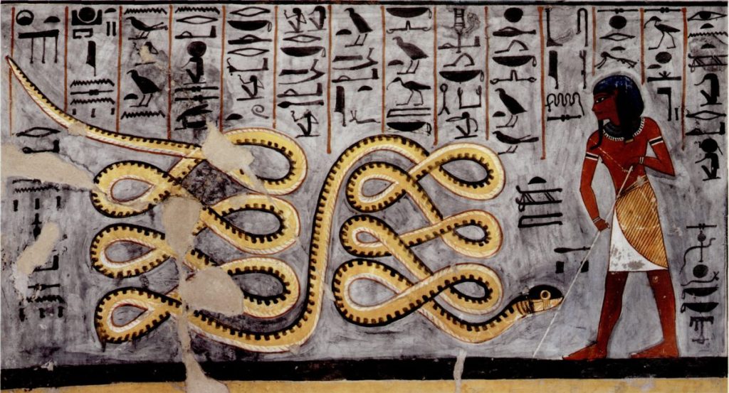 Nel pantheon delle divinità dell’antico Egitto troviamo Apopi, divinità rappresentata con le sembianze di un gigantesco serpente che simboleggia le tenebre, il male e il caos, in antitesi a Maat, simbolo di verità e ordine. Apopi osteggia quotidianamente il viaggio di Atum all’interno del Nun (l’oceano primordiale), per evitare che il sole sorga nuovamente, annunciando un nuovo giorno.