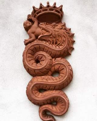 In araldica il serpente simboleggia l’astuzia, il dominio, l’eternità, la medicina e la prudenza. Può però anche rappresentare il nemico, il vizio, il grande tradimento, o la perfidia, specialmente quando è calpestato, morso o imbeccato da altri animali. Spesso viene rappresentato con le fauci aperte che trattiene la metà superiore d i un fanciullo. Riemerge l’antico mito di Atum: questa figura araldica rappresenta la forza primitiva della Natura che è sempre pronta a dare al Mondo un Nuovo Uomo o se vogliamo, una realtà rinnovata.