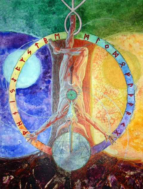 Ci hanno insegnato che il cielo è in alto e la terra è in basso ma nel mondo della Magia questo è vero solo in parte; la morale, le convenzioni fatte dagli uomini per ordinare il piano di vita in cui viviamo, sono molte volte fuorvianti per coloro che cercano di andare al di là dell’apparenza delle cose. Le leggi e i principi che valgono in Abred, il piano della Manifestazione, non sono gli stessi che valgono nel mondo di Gwynvyd, il mondo della coscienza spirituale, che possiamo definire piano di Realtà”. “Che altro?” chiese il Saggio Druido. Intervenne, nuovamente, la giovane druidessa: “La lancia con cui Odino si trafisse il costato, all’altezza del fegato, ha il significato di uccisione dell’ego; lì infatti vengono raccolte le nostre pulsioni e i nostri istinti. Per diventare tramite delle Rune è necessario aver sopraffatto, non ucciso, il proprio ego. Il fatto che Odino abbia donato, appena acquisite, le Rune agli uomini significa aver realizzato il superamento del proprio io in funzione del profondo spirito Druidico: esercitare il potere personale non per il proprio interesse ma per il bene degli altri”.