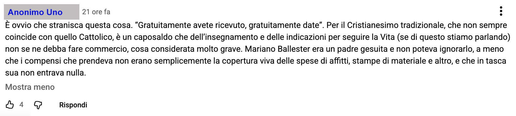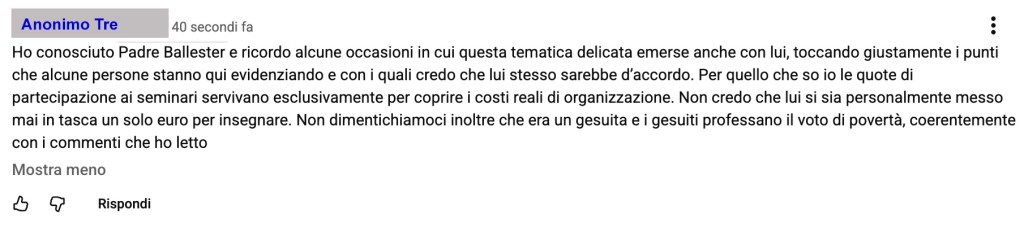 Anonimo Uno non sembra però soddisfatto da questa risposta, che gli appare evidentemente come una supercazzola spiritualizzata; inoltre nessuno ha scritto o dato a intendere qualcosa di male su Padre Mariano Ballester, quindi non si capisce il post scriptum alla fine.