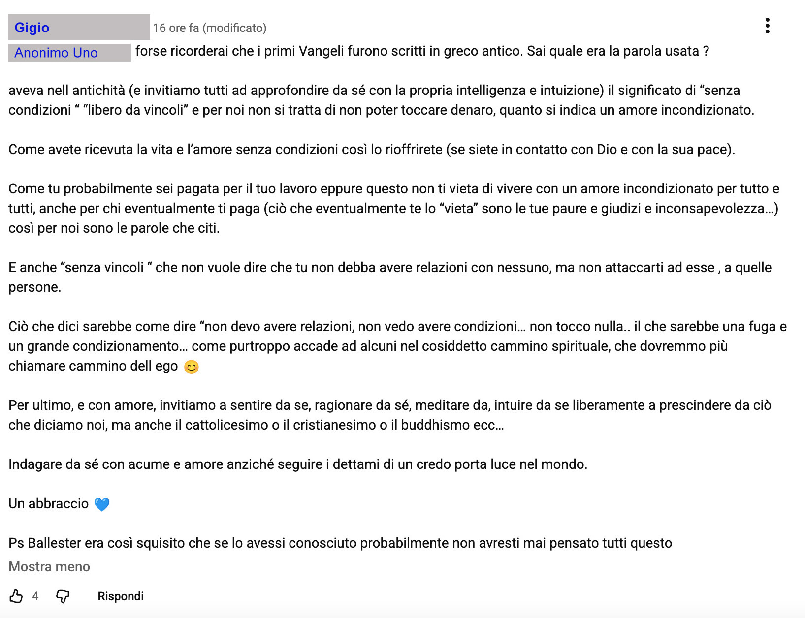 Gigio risponde con un lungo intervento. Il contenuto è denso e spiritualizzato, ma il punto centrale viene nuovamente aggirato. Il tema non è più la domanda iniziale (alla quale è ormai chiaro che non vuole rispondere) bensì una difesa preventiva della propria posizione: