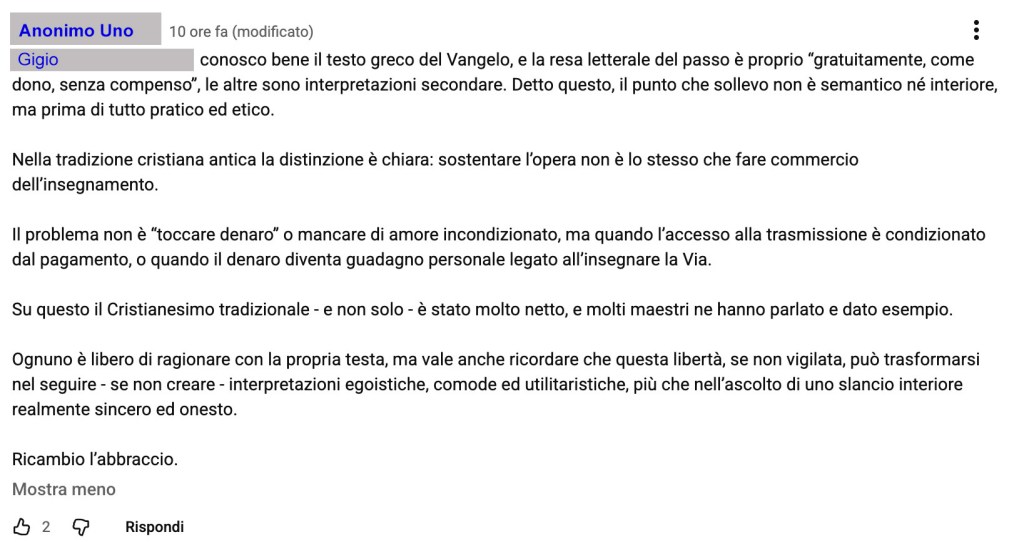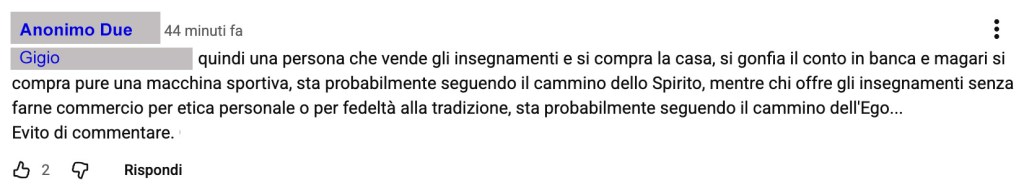 Sotto il video, nei commenti, una persona pone una domanda semplice, lineare, priva di ironia o polemica, chiedendo se il maestro citato nel video chiedeva compensi economici a fronte degli insegnamenti che elargiva. Solo lecita curiosità. E qui l’avventura ha inizio.
